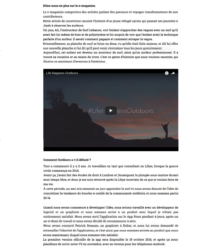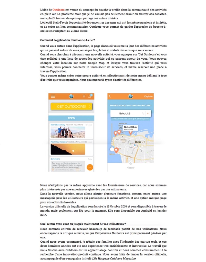 À cette période, un ami m’a emmené un jour apprendre le surf et nous avons discuté de l’idée de concrétiser la tendance du bouche-à-oreille de la communauté outdoors, et nous sommes partis de là. Quand nous avons commencé à développer l’idée, nous avions travaillé avec un développeur de logiciel et un graphiste et nous sommes arrivé à un produit avec lequel je n’étais pas entièrement satisfait. Nous avons sorti l’application sur le App Store pendant 4 jours, après un an et demi de travail et nous avons décidé de recommencer à zéro. Nous avons contacté Patrick Semaan, un graphiste à Dubai, et nous lui avons demandé de retravailler l’identité de l’application, et c’est ainsi que nous sommes arrivés au produit que nous avons maintenant, duquel nous sommes très satisfait.
