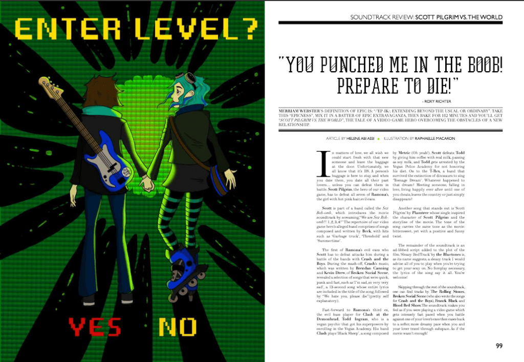Fast-forwarding through the rest of the soundtrack, one can find tracks by The Rolling Stones. Broken Social Scene (who also wrote the songs of Crash and the Boys), Franck Black and Blood Red shoes. As if the movie wasn’t enough, the soundtrack makes you feel as if you were playing a video games, getting intense and fast paced when you get in a fight against one of your lover’s exes, getting back to a softer, more dreamy pace when you and your lover are traveling in subspace.