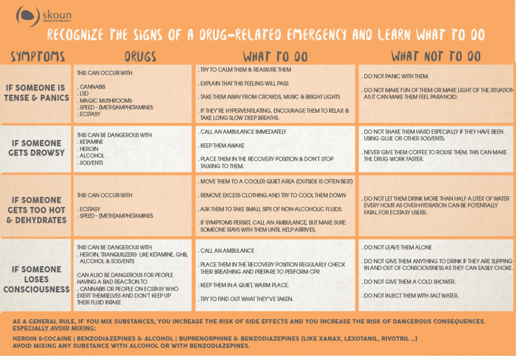 I designed a table entitled Recognize the Signs of a Drug-Related Emergency & Learn What to do, that was shared on Skoun’s website and social media platforms.